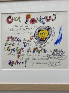 Inne i Grand Palais fick vi se endast några delar av den voluminösa damen, men desto mer av Nikis mycket rika och färgsprakande produktion med många andra tjocka figurer. Framför allt lärde vi oss mycket om Niki de Saint Phalles utveckling som konstnär genom årtiondena, hennes speciella sätt att skapa sitt verk, som t.ex. använda gevär för att skjuta hål på färgpåsar som rann ner för taveldukarna… och mycket annat spännande. Niki gjorde många konstverk i samarbete med sin partner Jean Tinguely, vars skulpturer i metall ofta var i rörelse, svängde fram och tillbaka och ibland skramlade till. Det kändes som en stor lekplats för vuxna barn!